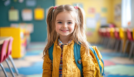 A cheerful little girl with her pigtails and a colorful backpack is happily smiling in her vibrant classroom setting