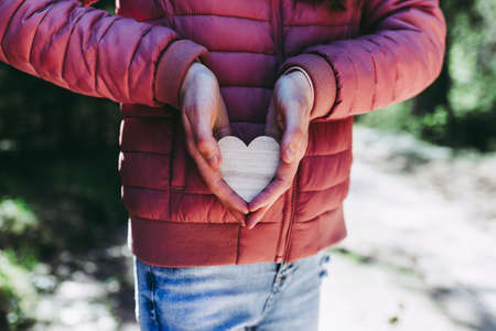 One joyful teen girl in forest holding a wooden heart in her hands.On spring or summer nice sunny day.Selective focus.