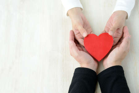 Love and Valentine's day concept. Adult and child hands holding red heart, family , love and good relationship.