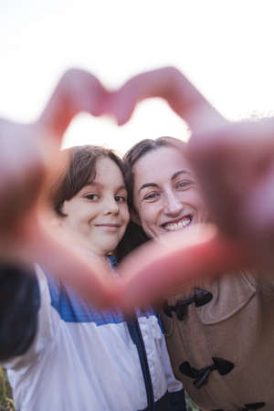 Child with mother folded fingers in the shape of a heart, Boy kisses and hugs mom, a portrait of a smiling woman, happy motherhood