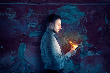 Incinerate shiny blazing aged open antique book on smoldering brushwood in blue night. Close-up macro view with space for text on black backdrop