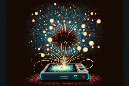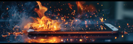 Dramatic and explosive scene of a smartphone device bursting into flames emitting intense sparks and fiery energy in a dynamic chaotic and hazardous display