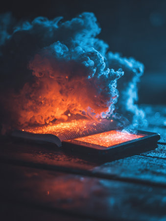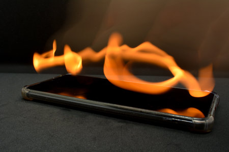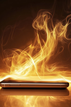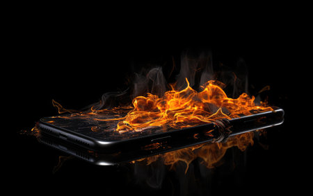a smartphone with flames and smoke emanating from it, creating a dramatic and intense visual effect. This image is interesting as it symbolizes overheating or potential danger associated with electronic devices.