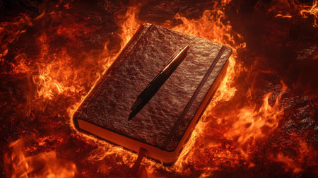 A leather journal with a sleek pen placed on its cover, enveloped by vivid flames, creating a dramatic and intense artistic ambiance.