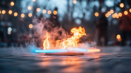 A striking image of fire and smoke, possibly a special effect or a controlled burn, with a blurred background of lights.