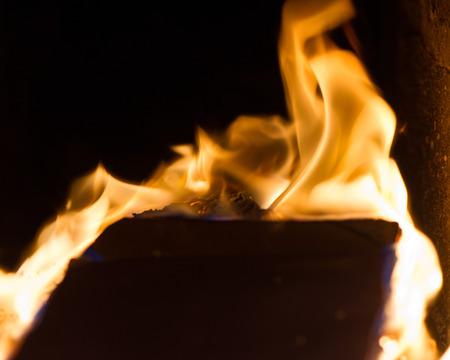 Old open book is burning. Big bright flame on papers. Destruction of diary in fireplace. Renunciation of past. Forbidden literature on bonfire. Censorship, prohibition of freedom information