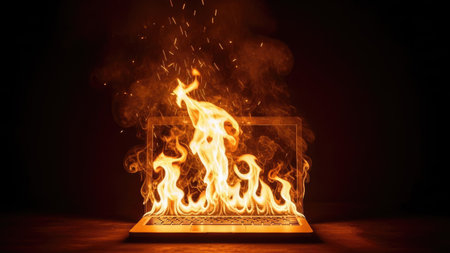 Burning laptop computer screen on dark background with copy space. 3d illustration