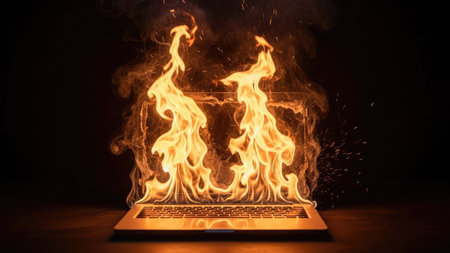 Burning laptop computer on wooden desk with black background. Computer security concept.