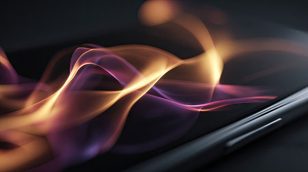 Levitating smartphone with blue and yellow smoke background, tech innovation concept