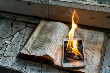 A burning book with bright flames and thick smoke, set against an orange background, emphasizing the heat and intensity.