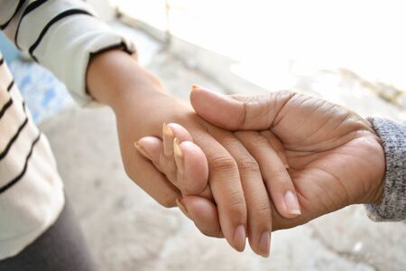 Close up granddaughter takes care of the health sick grandmother at home by holding hands. Lifestyle support the love of the family.