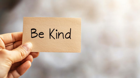 Handwritten note reading Be Kind on white background, perfect for World Kindness Day themes with copy space