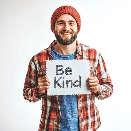 Bearded hipster man in checkered shirt and hat holding a sign with the text Be Kind.