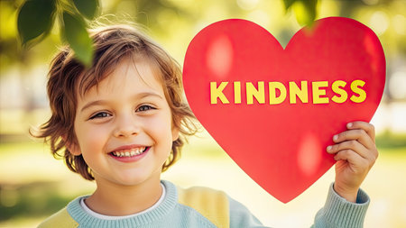 A young child is smiling and holding a large red heart with the word KINDNESS. The image features natural sunlight and soft focus. It conveys themes of childhood, compassion, and positivity. Suitable for use in projects related to emotional well-being, social issues, or educational materials.