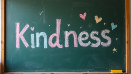 Kindness spelled in pastel chalk on blackboard with hearts and stars