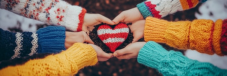 Diverse Hands in Colorful Knitted Sleeves Holding a Knitted Red Heart Symbol of Love and Unity