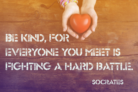 Be kind, for everyone you meet - ancient Greek philosopher Socrates quote printed on image of hahds with heart
