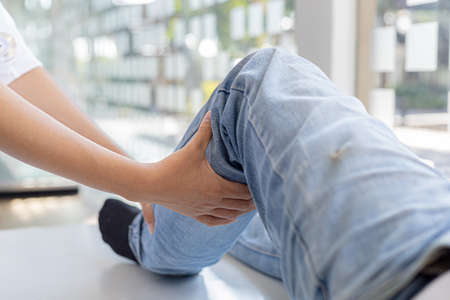 Masseur doing massage the knee to the young man. The doctor massages the leg for treatment.