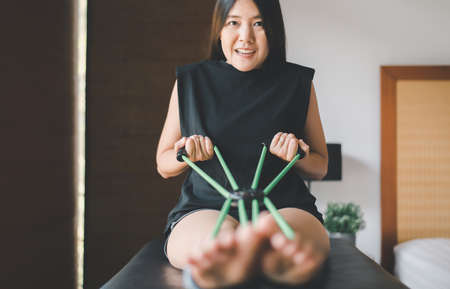 Therapist stretching woman’s leg. Shiatsu massage.