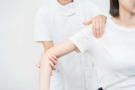 Female physiotherapists provide physical assistance to male patients with shoulder injuries massage their shoulders for muscle recovery in the rehabilitation center. Physiotherapy concepts.