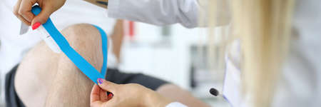 Knee joint of kinesiotape is fixed to patient in medical office.
