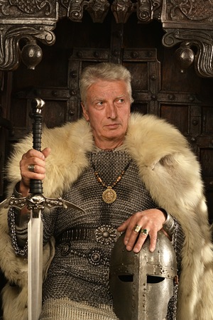 low key photo of king holding gold crown and sword. fantasy medieval period