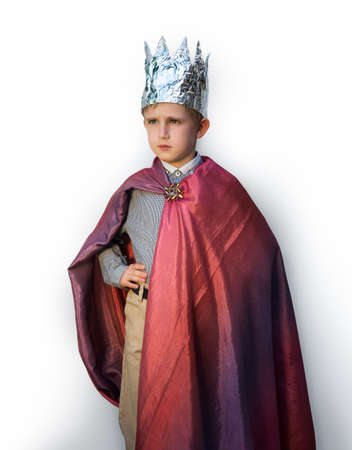 Closeup view old retro happy fun cute cape gold foil diadem gem text space. Funny pretty nice merry cheer cool guy son stand rich golden red mantl attir jewel tiara party joy tale story symbol concept