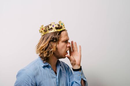Young man with a crown on his head on a light background. Concept is king, luck, gain, rich, dream, goal, aspiration. Banner.