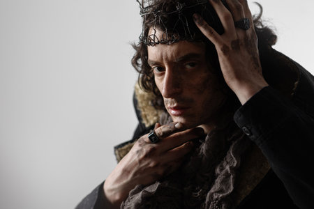 Hamlet in modern grunge or post-apocalyptic reinterpretation, young man, tragic Shakespearean hero in a crown of wire