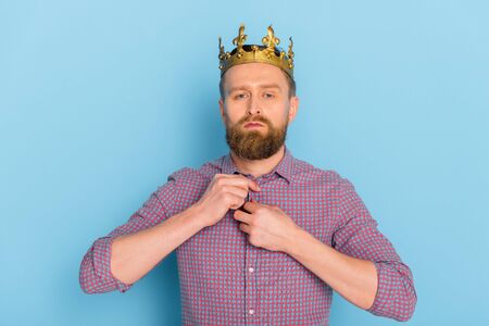 Portrait of confident ambitious man wearing golden crown, looking with arrogance, declaring his authority and leadership, superior privileged status. studio shot isolated on blue background