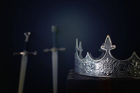 low key image of beautiful queen/king crown over antique book, chest and sword. fantasy medieval period