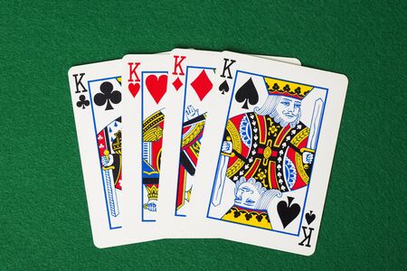 playing cards four of kings over red felt
