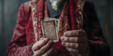 Magician show with playing cards. On grey background