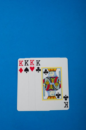 Playing cards isolated on blue background. Gambling.