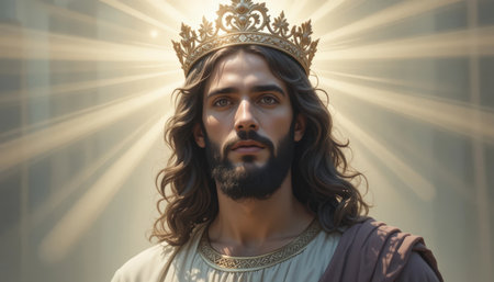 A serene depiction of Jesus Christ wearing a crown, surrounded by radiant light, showing casing divine presence.