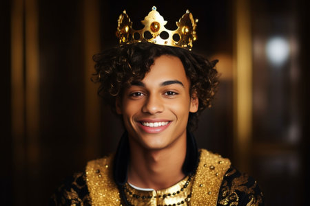 A young man wearing a gold crown on top of his head. This image can be used to depict royalty, leadership, or a celebration.