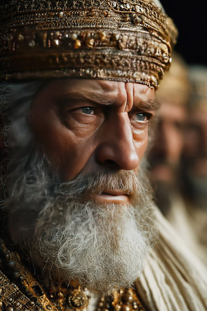 A close-up view of a dignified figure wearing a lavish crown adorned with jewels. His intense gaze and detailed facial features wisdom and strength, surrounded by others in similar attire.