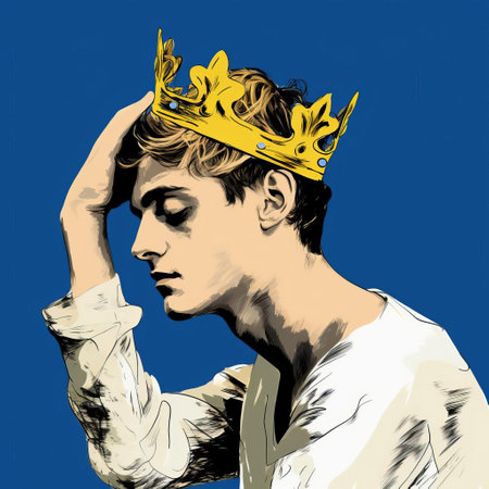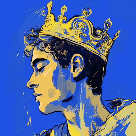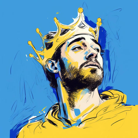 andrew, adorned with a regal crown, gazes over their shoulder in this stunning digital drawing, reminiscent of cecil beaton's iconic style, with bold, expressionist lines and vibrant blue hues, crafted on a wacom tablet, evoking the essence of matisse's masterpieces, in high-definition 32k super-resolution uhd quality. ai generated