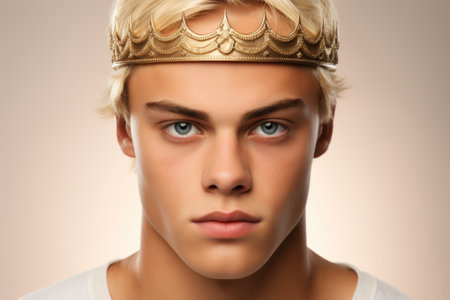 A young man wearing a crown on top of his head. Can be used for royalty, power, or leadership themes.
