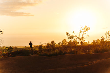 Silhouette of a photographer taking a picture from the top of Montana Roja volcano at dusk, Lanzarote, Canary Islands, Spain