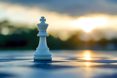 A chess king on the chessboard at dawn strategizing for the challenge ahead with the sun as its spotlight.