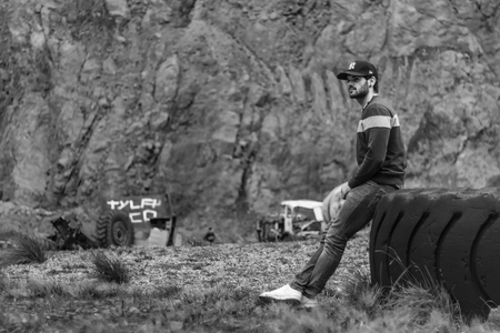 Youn attractive man with sunglasses standing and posing while looking in sunset. Outdoors portrait.