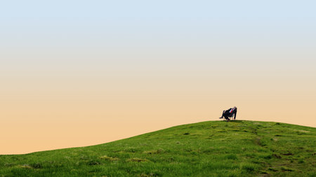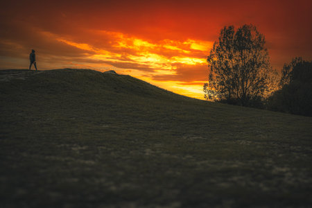 Silhouettes on a hilltop against sunset sky. Dry grass in overcast weather. Natural landscape in autumn.