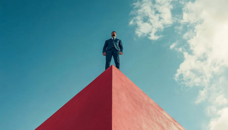 Businessman standing on upward arrow symbolizing achievement, growth, and success in business