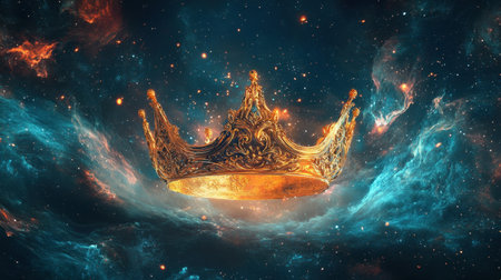 A stunning golden crown floats majestically in a vibrant cosmic nebula, surrounded by twinkling stars and colorful swirling gases, evoking themes of royalty and fantasy.