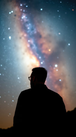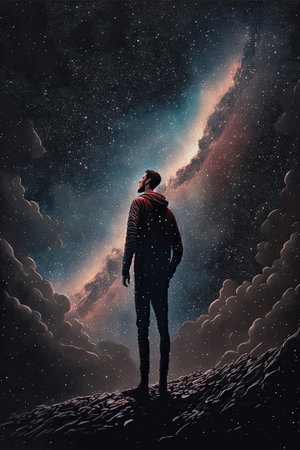 Fantasy illustration of young man standing and looking up to the mysterious starry night sky and the universe above. Generative AI