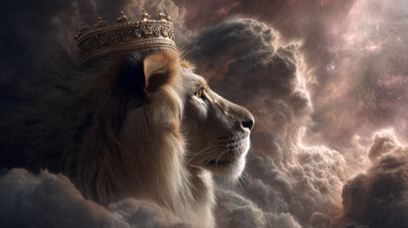 a majestic lion king with a golden crown, surrounded by ethereal clouds. a stunning fantasy art piece, perfect for wallpaper or background use.
