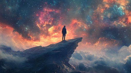 A solitary figure stands atop a rocky peak, gazing out at a breathtaking nebula filled with vibrant colors and countless stars against a dark, expansive sky.