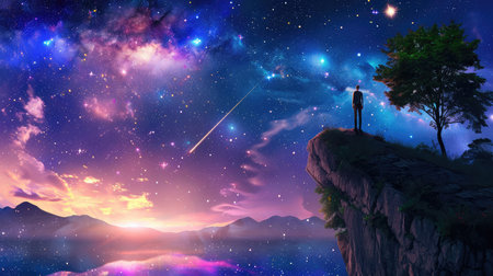A breathtaking night scene depicts a vibrant star-filled sky with a person standing on a cliff by the sea, inspiring feelings of wonder and tranquility.