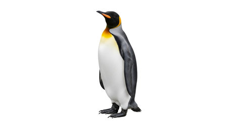 This image features a single King Penguin standing upright on a white background. The penguin has distinct black and white plumage with an orange band around its upper chest and head. The image is clear and SEO-friendly, highlighting the penguin's natural beauty against a plain white backdrop.